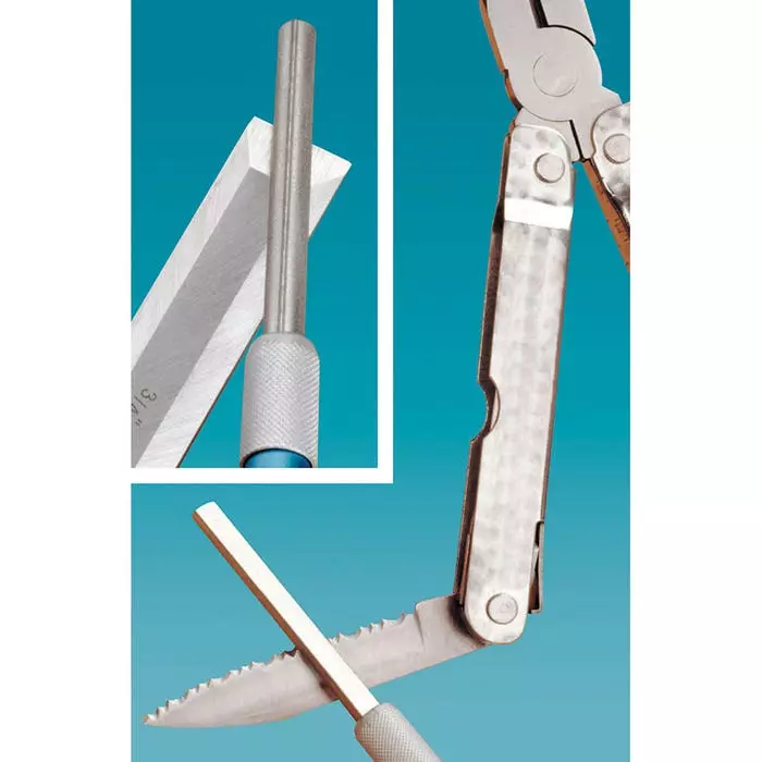 This Multi-Sharp Diamond Tool Sharpener is a highly versatile sharpener, with 3 sharpening surfaces. The sharpener has thousands of high quality industrial grade diamond particles permanently bonded to a steel alloy. Diamond is widely used in industry as the top sharpening material. It is very long lasting, retains its flatness and sharpens the hardest materials (including carbide, ceramic and stainless steel).