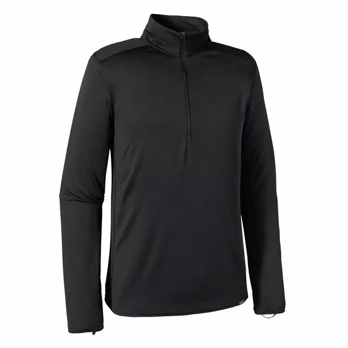 The fabric is bluesign™ approved, has 93% recycled-polyester content and is treated with Polygiene® permanent odour control. Features include a long center-front zipper for venting, internal neck tape for next-to-skin comfort, full underarm gussets for unhindered shoulder mobility, elastic thumb loops for secure hand coverage, flatlock seams to minimize chafing, offset shoulder and side seams to lie smoothly beneath pack straps, and a drop tail for additional coverage.