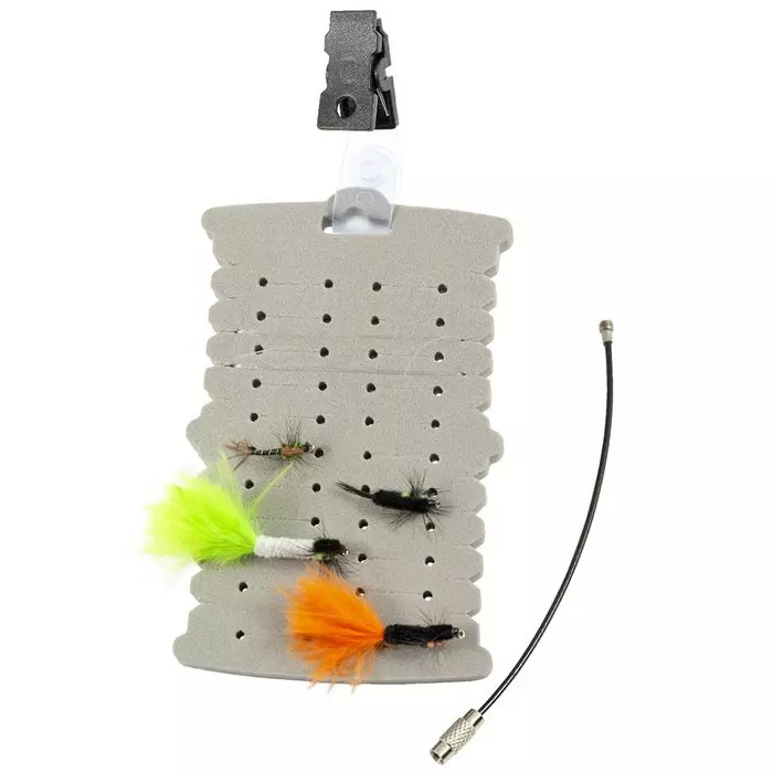 An ethafoam Keeper Patch with 22 slits for flies, plus 10 fine slits down each side, to securely hold wound on leaders, ready for use. Fitted with a simple clip at the top, to attach to a vest pocket flap, but also comes with a plastic covered wire cord, to attach to a D-Ring.