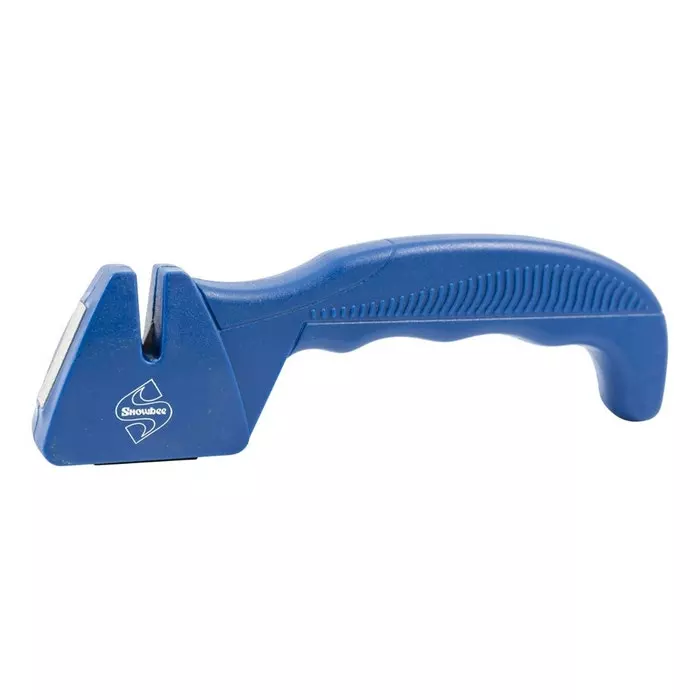 There are twin Tungsten Carbide sharpening blades, for all knives, plus a grooved, stainless carbide hook sharpener on the end. Rugged moulded construction, with finger ‘grips’ on handle and a rubber base pad, to hold sharpener in place, during use.